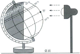 地理课堂上,老师将一盏电灯放在桌子上代表太阳,在电灯旁放个地球仪代表地球,拨动地球仪模拟演示地球自转运动,让同学们观察地球仪的受光区域及其变化。读地球自转演示图,完成1~3题。