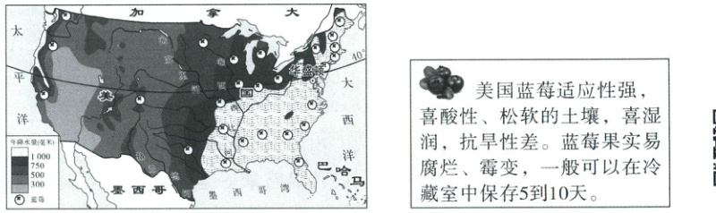 【解析】本题考查美国本土蓝莓的分布和自然原因、美国的新品种蓝莓成为主栽果树树种的主要原因、蓝莓产量大和商品率高的原因以及对我国蓝莓产业发展的建议。