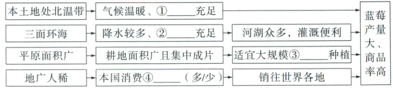 (3) 新考法 思维导图 美国的蓝莓产量大、商品率高,请分析其原因并完成下列思维导图。