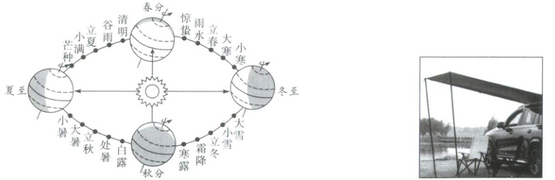 11. 清明时节(2025年4月4日),家住西安市的小白一家前往郊外踏青露营,他们将车按东西方向停放,小白利用所学的地理知识为露营设备的搭建出谋划策。读二十四节气图和露营车示意图,完成下列问题。
