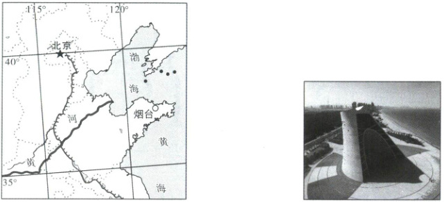 2025年春分日,在烟台金沙滩公园扬帆广场上,一座独特的建筑——时光塔迎来了专属的光影盛宴。当天随着时间推移,时光塔的影子正好与广场上设置的时光水道重合,呈现为一条直线。读烟台位置示意图和时光塔景观图,完成8~10题。