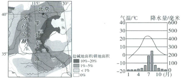 11. 华北平原耕地面积约占我国耕地面积的40%,主要实行夏玉米—冬小麦轮作制,是我国主要的粮食产区之一。然而,一些地区降水不足,地下水遭到破坏,旱涝灾害频发。读华北平原简图及气候资料图,完成下列问题。