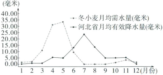 植物根层土壤水分的部分,右图为河北省冬小麦月均需水量和月均有效降水量统计图。