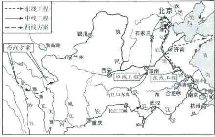(人教地图改编)南水北调工程是我国跨流域、跨区域调水的骨干工程,该工程分为东、中、西三条调水线路。读南水北调路线示意图,完成8~10题。