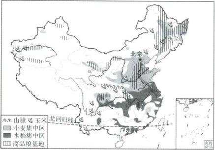 8. 粮食安则天下安,粮食安全是“国之大者”。中国粮食育种技术创新,土地连年丰收,长期保持库存充足,并具备完善的粮食储备体系,牢牢守护“中国饭碗”。读我国主要粮食及商品粮基地分布图,完成下列问题。
