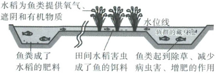 “稻鱼共生”立体农业模式历史悠久,据《青田县志》记载“田鱼,有红、黑、驳数色,土人在稻田及圩池养之”。近年来通过稻田种养新技术,在种稻的同时养殖鱼、虾和蟹,在此基础上探索稻谷秸秆的低碳利用方式,实现了绿色、低碳发展。读“稻鱼共生”立体农业模式示意图,完成6~7题。