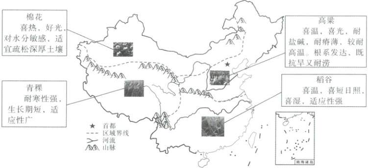 新考法 跨生物学学科 中国农业文化源远流长,农业文明已深深融入居民生产生活。其中,用农作物颜色来命名的中国色彩传承千年,具有独特韵味。某地理研学小组分别从中国四大地理区域选取了稻谷黄、高粱红、棉花白、青稞黑四种颜色,探究我国区域地理差异与农业发展之间的关系。读中国四大地理区域图,完成 4~6 题。