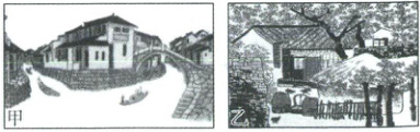 五谷粮食画是以各类植物种子和五谷杂粮为主要材料,通过粘、贴、拼、雕等手段特殊处理而成的图画。地理社团同学们参观五谷画艺术馆,欣赏到描绘我国南、北方地区民居景观的两幅代表作。读甲、乙两幅五谷粮食图画,完成 7~9 题。