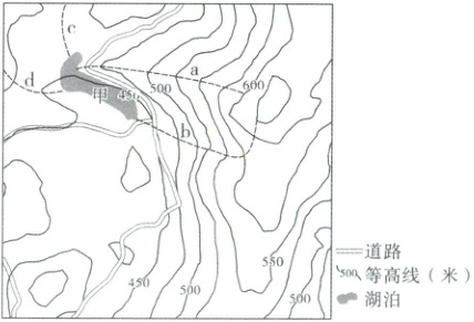 5.B [解析]本题考查地形部位的判读。结合题干及所学可知,甲湖泊是由溪流汇聚形成,而河流多分布于山谷,且从高处流向低处;读图可知,b处等高线凸向海拔高处,为山谷,易发育河流,且海拔高于甲湖泊,溪流会汇入湖泊。