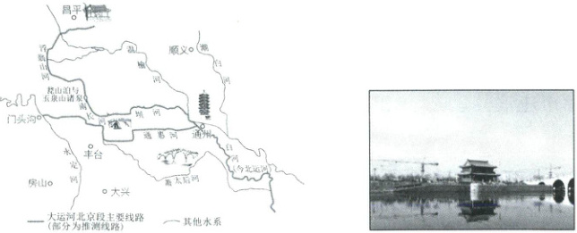(中图地图改编)蜿蜒流淌的京杭大运河是北京城市副中心闪亮的文化名片,旖旎风光中沿线丰富的历史文化资源讲述着悠久的运河故事。2024 年 2 月 6 日,文化和旅游部发布消息,确定北京(通州)大运河文化旅游景区为国家 5A 级旅游景区。读大运河北京段示意图与大运河景观图,完成 6~7 题。