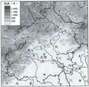 2025 年两会于 3 月正式在北京召开,其中全国政协第十四届第三次会议于 3 月 4 日开幕,第十四届全国人民代表大会第三次会议于 3 月 5 日开幕。读北京市地形图,完成 1~3 题。