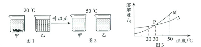 3. $20\ ^{\circ}C$时,将等质量的甲、乙两种固体物质(不含结晶水),分别加入到盛有$100\ g$水的烧杯中,充分搅拌后现象如图1,加热到$50\ ^{\circ}C$时现象如图2,甲、乙两种物质的溶解度曲线如图3。则下列说法中正确的是(
