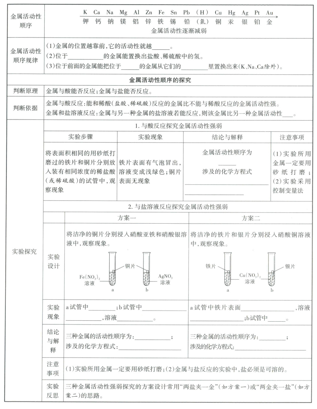 2.【现象】无现象 铜片表面有银白色物质生成 由无色变为蓝色 有红色物质出现 由蓝色变为浅绿色 无现象