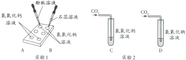 (1)实验方法:如图所示,向氢氧化钙、氢氧化钠溶液中,实验1分别滴加1~2滴紫色石蕊溶液和无色酚酞溶液;实验2分别通入一定量二氧化碳。