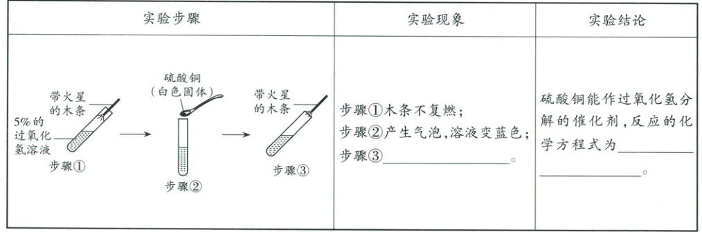 4.【实验探究】带火星的木条复燃$ 2H₂O₂\stackrel{CuSO₄}{=\!=\!=}2H₂O+O₂↑$