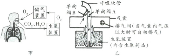 7. (跨学科)小金设计了一款在缺氧环境或出现高浓度有毒有害气体环境下逃生时使用的自救呼吸器。其设计思路如图甲所示,自救呼吸器的结构如图乙所示(其中箭头方向表示气体流动方向)。