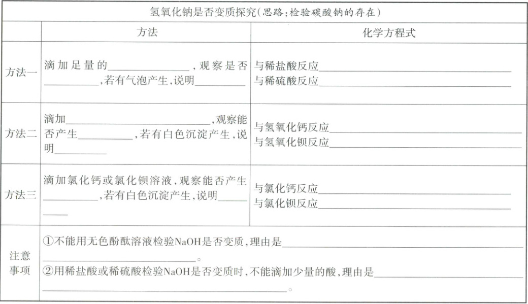 【注意事项】氢氧化钠变质后生成的碳酸钠溶液 也呈碱性,也能使酚酞溶液变红 酸的量太少, 先与氢氧化钠反应,无法检验碳酸钠是否存在
