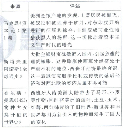 6.C 【解析】本题考查对新航路开辟的评价。选择 C:根据材料并结合所学知识可知,新航路的开辟深刻影响了人类历史的发展进程。马克思从唯物史观的角度,评述新航路开辟后欧洲国家对被征服地区的掠夺是资本主义原始积累的主要因素;斯塔夫里阿诺斯从全球史观的角度,评述新航路的开辟使伊比利亚国家在短暂繁荣之后走向衰退,在欧洲经济格局中处于从属地位;查尔斯·曼恩从生物学角度评述新航路的开辟促进了全球物种的大交换,这体现出学者看待问题的不同角度影响了对史实的评述。排除 A:材料中三种评述均是针对新航路开辟这一史实。排除 B:真实客观的史实是学者评述的基础,此项说法错误。排除 D:材料中对史实的评述有所侧重并非由于时期不同,而是角度不同。