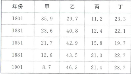 15.A【解析】本题考查工业革命的积极影响。选择A:根据材料数据可知,乙项劳动力占就业人口总数的比重从1801年的29.7%持续上升至1901年的46.3%,这与工业革命时期英国工业化进程高度吻合,19世纪英国工业迅速发展,制造业、矿业和建筑业作为工业革命的核心产业,吸纳大量劳动力,其劳动力占就业人口总数的比重必然显著增长。排除B:家庭和个人服务及公共事业受工业化影响有限,其劳动力占比在19世纪难以大幅提升。排除C:甲项从1801年的35.9%大幅降至1901年的8.7%,符合农业在工业化进程中地位下降的规律,甲项应为农业、林业和渔业。排除D:丙和丁在19世纪后期劳动力占就业人口总数的比重小幅增长,可能对应商业和交通业(如铁路兴起)及服务业,但乙项劳动力占就业人口总数的比重持续高增长更符合工业部门特征。