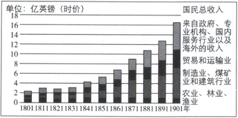 (1)第一小问主要变化,根据材料一“19世纪初至20世纪初英国国民收入总量及结构示意图”,可得出国民总收入增长了近6倍,第二、三产业较大幅度增长,农业、林业、渔业所占比重变化不大,制造业、煤矿业和建筑行业逐渐成为主导产业,贸易和运输业收入与来自政府、专业机构、国内服务行业以及海外的收入增长明显。第二小问原因,根据材料时间1801—1901年并结合所学得出经过工业革命,英国成为“世界工厂”,海外殖民地和市场广阔;结合所学英国的城市化发展历程得出工业化和城市化进程加快。