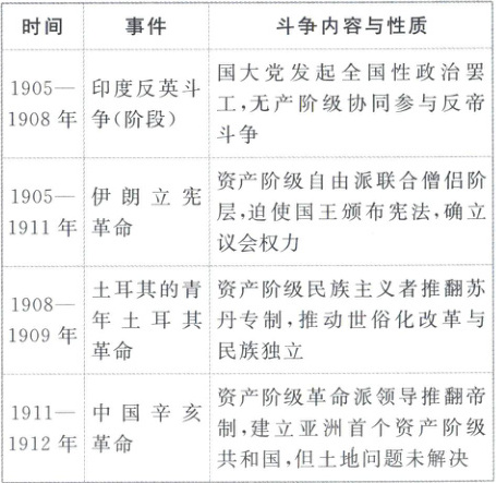 16.A【解析】本题考查亚洲资产阶级革命的民族民主性。选择A:材料中印度反英斗争由国大党(资产阶级政党)领导,伊朗立宪革命由资产阶级自由派主导,土耳其的青年土耳其革命由资产阶级民族主义者推动,中国辛亥革命由资产阶级革命派领导,这些事件均以资产阶级为领导核心,争取民族独立、民主宪政或建立共和国,体现资产阶级领导民族民主革命成为20世纪初亚洲的潮流。排除B:材料仅提及印度无产阶级协同参与反帝斗争,而伊朗则由资产阶级联合僧侣,土耳其和中国皆由资产阶级主导,这一阶段无产阶级未在亚洲各国普遍登上政治舞台。排除C:印度反英斗争、伊朗立宪革命、土耳其革命、中国辛亥革命均为国家独立斗争,反帝反封建斗争未形成跨国联合局面。排除D:殖民体系虽受冲击,但材料聚焦资产阶级领导革命的性质,如伊朗和土耳其侧重反专制而非直接反殖民,中国推翻帝制但未解决土地问题,殖民体系并未遭遇系统性的挑战。