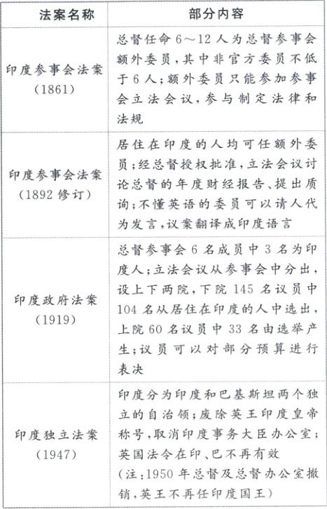 (2)结合所学知识,从19世纪中期印度反英大起义、19世纪末国大党的成立与工人罢工、一战后的非暴力不合作运动,以及二战后的“印巴分治”、印度独立等史实简述英国对印殖民政策的改变。