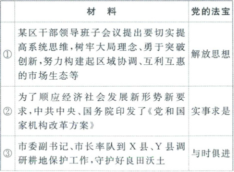 3.A 【解析】本题考查坚持解放思想、实事求是、与时俱进、求真务实。材料中的“树牢大局理念、勇于突破创新”体现了解放思想,①入选;为了顺应经济社会发展新形势新要求,印发了《党和国家机构改革方案》体现了实事求是的工作思路,②入选;调研耕地保护工作是常规事项,没有体现与时俱进,③排除;网络点赞量高的建议未必是真实的、正确的建议,不符合求真务实的要求,④排除。