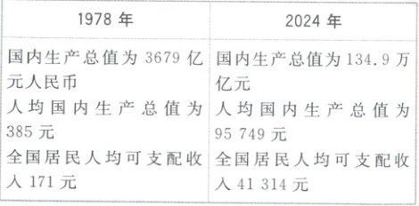 2. [湖南娄底部分学校 2025 段考·改编]下表为 1978 年和 2024 年中国国内生产总值、人均国内生产总值和全国居民人均可支配收入对比。