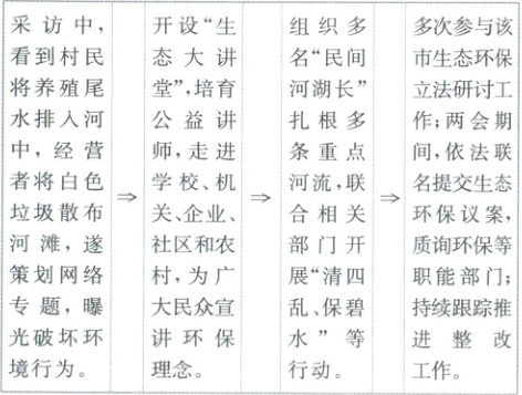 3. [浙江嘉兴 2025 段考]围绕“生态环保——守护母亲河”主题,某新闻记者作为市人大代表的履职过程如下: