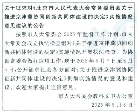 ②行使立法权,制定推进京津冀协同创新共同体建设的决定