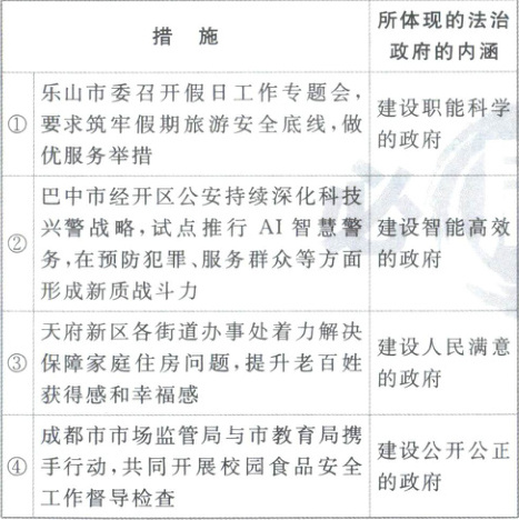 2.C 【解析】本题考查法治政府的内涵。巴中市经开区公安持续深化科技兴警战略,试点推行AI智慧警务,在预防犯罪、服务群众等方面形成新质战斗力,体现了运用技术提高治理效能,建设智能高效的政府,②正确;天府新区各街道办事处着力解决保障家庭住房问题,提升老百姓获得感和幸福感,这体现了建设人民满意的政府,③正确;乐山市委是中国共产党在乐山市设立的领导机关,不是政府部门,不能体现法治政府的内涵,①排除;成都市市场监管局与市教育局携手行动,共同开展校园食品安全工作督导检查,这体现的是政府各部门协同合作,职能科学,而不是建设公开公正的政府,④排除。