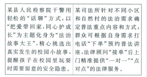 3.B 【解析】本题考查建设法治社会。县人民检察院通过“法治故事大王”的形式,以生动案例进行校园安全教育,体现了普法形式的创新(从传统宣讲变为情景化、故事化),某司法所采取群众“下单”、法律顾问“接单”的精准服务模式,强调普法形式的灵活性和针对性,深化了法治实践,B正确;题干未提及多个部门合作,故“强化部门协作”未体现,A排除;题干中虽然提到了校园安全,但并没有提到扩大援助范围,且未能概括司法所的普法举措,C排除;“完善法律服务,助力乡村振兴”与某县人民检察院干警的做法不符,D排除。