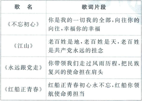 3.D【解析】本题考查党的宗旨。从《不忘初心》中的“向往你的向往,幸福你的幸福”,到《江山》中的“老百姓是共产党永远的挂念”,再到《永远跟党走》中的“把民族复兴的使命担在肩头”,以及《红船正青春》中的“红船你领航使命勇担当”,都体现了党始终坚持为中国人民谋幸福,为中华民族谋复兴的初心和使命,也体现了党始终坚持全心全意为人民服务的根本宗旨,②④入选;材料中的歌词主要强调的是党与人民的关系,并未直接涉及党的方针政策与先进生产力的发展要求,①排除;党的性质和宗旨决定了党除了工人阶级和最广大人民的根本利益,没有任何自己的特殊利益,从来不代表任何利益集团、任何权势团体、任何特权阶层的利益,这是党立于不败之地的根本所在,③排除。