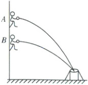 3. [天津2025高一下期末](多选)如图所示,在投球游戏中,小明坐在可沿竖直方向升降的椅子上,椅子停在不同高度的$A$、$B$两处,将皮球水平抛出,最后都落入固定的球筐中,不计空气阻力.下列说法正确的是(