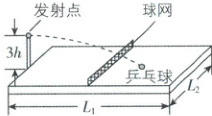 6. [江西南昌 2025 高一下月考]一带有乒乓球发射机的乒乓球台如图所示. 水平台面的长和宽分别为 $L_{1}$ 和 $L_{2}$,中间球网高度为 h. 发射机安装于台面左侧边缘的中点,能以不同速率向右侧不同方向水平发射乒乓球,发射点距台面高度为 3h. 不计空气的作用,重力加速度大小为 g. 若乒乓球的发射速率 v 在某范围内,通过选择合适的方向,就能使乒乓球落到球网右侧台面上,则 v 的取值范围是 (