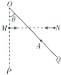 7. C 【解析】平抛运动竖直方向为自由落体运动,有$h = \frac{1}{2}gt^2$,下落时间为$t = \sqrt{\frac{2h}{g}}$,砸到挡板上不同点时,小球下落的高度不同,则从$M$点以不同速度抛出的小球砸到挡板的时间不同,A错误;由题意知从$M$点抛出砸在$A$点的小球,在$A$点速度的方向与挡板平行,作出运动示意图,如图所示,平抛运动速度反向延长线过水平位移的中点,则有$FA = 2ME$,由几何关系可得$OF = FA = OA\cos45° = \sqrt{2}L × \frac{\sqrt{2}}{2} = L$,$E$为$OA$的中点,$M$为$OF$的中点,则$FM = \frac{1}{2}OF = \frac{L}{2}$,对于从$M$点抛出砸在$A$点的小球有$\frac{L}{2} = \frac{1}{2}gt_1^2$,$L = v_1t_1$,解得$v_1 = \sqrt{gL}$,D错误;从$N$点水平向左抛出的小球落在$A$点且位移最小,则有$NA \perp OQ$,由D项分析及几何知识可得$NG = AG = \frac{L}{2}$,对从$N$点抛出的小球有$\frac{L}{2} = \frac{1}{2}gt_2^2$,$\frac{L}{2} = v_2t_2$,解得$v_2 = \frac{\sqrt{gL}}{2}$,C正确;由图可知,$AE = \frac{\sqrt{2}}{2}L$,$E$点与$M$点在同一水平面上,最远点为$A$,从$M$点抛出的小球在挡板上砸出的痕迹长度小于$EA$长度,即从$M$点抛出的小球在挡板上砸出的痕迹长度小于$\frac{\sqrt{2}}{2}L$,B错误。