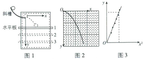 (3) 经过一系列正确的操作,得到如图2所示的一条轨迹.在该图线上采集若干点测量其坐标$(x,y)$,进而运用图像法处理数据,得到如图3所示的图像,其斜率$k = 2.50\ m^{-1}$,由此可知小球做平抛运动的初速度大小为