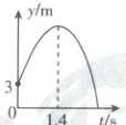 2. [天津五区重点校2025高一下联考]一可视为质点的滑雪运动员从距离跳台底部高为$h = 3\ m$的倾斜跳台滑出后,在空中运动过程中,他离跳台底部所在水平面的高度$y$随时间$t$变化的图线如图所示.已知$t = 1.4\ s$时运动员恰好到达最高点,$g$取$10\ m/s^{2}$,不计空气阻力,下列说法正确的是(