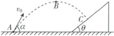 3. [云南2025高一下联考]如图所示,从水平面上的$A$点以倾角$\alpha$斜向上抛出一小球,抛出时速度大小为$v_{0}$,小球落到倾角为$\theta$的斜面上的$C$点时,速度方向恰好与斜面垂直,$B$为小球运动的最高点,已知重力加速度为$g$,则(