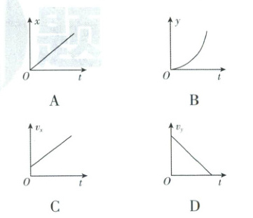8. [辽宁大连八中2025高一上月考]一条河流某处存在高度差,小鱼从低处向上跃出水面,冲到高处。如图所示,以小鱼跃出水面处为坐标原点,x轴沿水平方向,建立坐标系,小鱼的初速度为v₀,末速度v沿x轴正方向。在此过程中,小鱼可视为质点且只受重力作用。关于小鱼的水平位置x、竖直位置y、水平方向分速度v_x和竖直方向分速度v_y与时间t的关系,下列图像可能正确的是(