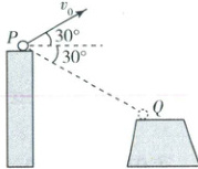 6. [山东2024·12](多选)如图所示,工程队向峡谷对岸平台抛射重物,初速度$v_{0}$大小为$20m/s$,与水平方向的夹角为$30^{\circ}$,抛出点$P$和落点$Q$的连线与水平方向夹角为$30^{\circ}$,重力加速度大小取$10m/s^{2}$,忽略空气阻力。重物在此运动过程中,下列说法正确的是(