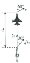 1. 歼-10CE是中国航空工业自主研制的全天候、单发单座、多用途三代+战斗机。假设某次训练中歼-10CE发射速度大小为$2v$的导弹追击“敌机”,二者速度均向正北方向。当二者距离为$d$时,“敌机”发现了导弹,飞行员立即转向,使飞机沿北偏东$60^{\circ}$以速度大小为$v$飞行,导弹也同时点火调整,瞬时获得一个北偏东$30^{\circ}$、大小为$\sqrt{3}v$的分速度。导弹与“敌机”始终处于同一水平面内,则导弹击中“敌机”的时间为(