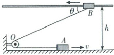 2. (多选)同一竖直平面内存在两条相距为$h$的水平轨道,$A$、$B$两个物体分别位于两轨道上,两个物体通过一根不可伸长的轻质细绳跨过光滑的定滑轮连接在一起。通过外力使$A$物体以速度$v$向右匀速运动,当细绳与水平方向的夹角$\theta = 30^{\circ}$时,$B$物体上的一滴水与$B$分离,不计空气阻力,重力加速度为$g$,下列说法正确的是(