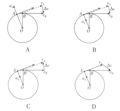 2.B [解析]速度是矢量,物体从A运动到B,$\Delta v$由$v_A$指向$v_B$,作矢量图时需将各矢量的起始点移至同一点,故C、D错误;做匀速圆周运动的物体加速度指向圆心,故B正确,A错误。