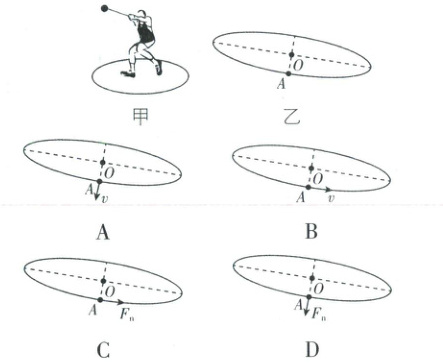 7. [山东名校考试联盟2025期中]如图甲所示,运动员甩动链球时,链球在倾斜面内绕$O$点做匀速圆周运动,链球的运动轨迹可简化为图乙中的实线。链球经过$A$点时速度$v$的方向或向心力$F_{n}$的方向可能正确的是(