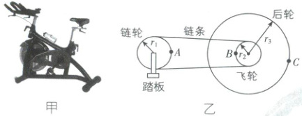2. [湖南岳阳汨罗一中2025高一下期中]为防止航天员的肌肉萎缩,中国空间站配备了健身自行车(图甲),自行车简化模型如图乙所示。自行车链轮、飞轮、后轮的半径都不相同,半径分别为$r_{1}$、$r_{2}$、$r_{3}$。下列关于边缘上的三个点$A$、$B$、$C$的说法正确的是(