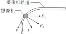 1.D [解析]摄像机在弯道上运动的速度大小不断增加,方向不断变化,则速度不断变化,故A错误;当运动员加速通过弯道时,摄像机与运动员保持同步运动,则摄像机也要加速转弯,摄像机所受合外力方向与速度方向夹角为锐角,可知合外力大致方向为$F_1$,故B错误;摄像机与运动员保持同步运动,则摄像机的角速度与运动员的角速度相等,故C错误;根据$a = \omega^2 r$,摄像机的转动半径大于运动员的,可知摄像机的向心加速度大于运动员的向心加速度,故D正确。
