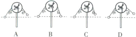 3. [江苏扬州中学2025高一下月考]四个拨浪鼓上分别系有长度不等的两根细绳,绳一端系着小球,另一端固定在关于手柄对称的鼓沿上。现使鼓绕竖直放置的手柄匀速转动,两小球在水平面内做周期相同的匀速圆周运动。下列各图中两球的位置关系可能正确的是(图中细绳与竖直方向的夹角$\alpha \lt \theta \lt \beta$)(
