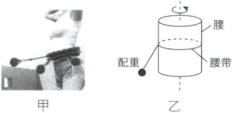 8.B [解析]匀速转动时,配重受到的合力提供配重做匀速圆周运动的向心力,其大小不变,但方向时刻变化,故配重受到的合力改变,故A错误;以配重为研究对象,受到重力和拉力,设配重的质量为$m$,如图1所示,竖直方向根据平衡条件可得$F_{T}\cos\theta = mg$,水平方向由牛顿第二定律可得$F_{n} = mg\tan\theta = m(2\pi n)^{2}r$,其中$r = L\sin\theta + r_{0}$,转速增大,配重做圆周运动所需的向心力增大,分析可知$\theta$增大,$F_{T}$增大,设腰带的质量为$M$,对腰带进行受力分析如图2所示,水平方向根据平衡条件可得$N = F_{T}'\sin\theta$,又$F_{T}' = F_{T}$,若增大转速,$F_{T}'$和$\theta$都增大,则腰带受到腰的弹力变大,根据牛顿第三定律可知,腰受到腰带的弹力变大,故B正确;计数器显示在$1min$内圈数为120,可得周期为$T = \frac{1}{120}min = \frac{60}{120}s = 0.5s$,角速度$\omega = \frac{2\pi}{T} = \frac{2\pi}{0.5}rad/s = 4\pi rad/s$,故C错误;根据图1结合牛顿第二定律可得$mg\tan\theta = m\omega^{2}r$,而配重做圆周运动的半径为$r = r_{0} + L\sin\theta$,计算可知$\theta$不等于$37^{\circ}$,故D错误.