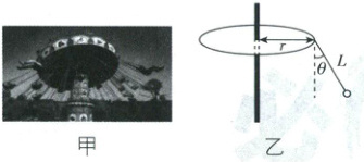 6. 教材变式[广东广州十六中2025高一下期末]一种叫“旋转飞椅”的游乐项目如图甲所示,其结构简化模型如图乙所示。长为$L$的钢绳一端系着座椅,另一端固定在半径为$r$的水平转盘边缘。转盘可绕穿过其中心的竖直轴转动。转盘静止时,钢绳沿竖直方向自由下垂;转盘匀速转动时,钢绳与转轴在同一竖直平面内,且与竖直方向的夹角为$\theta$。将游客和座椅看作一个质点,不计钢绳重力和空气阻力,重力加速度大小为$g$。下列说法不正确的是(